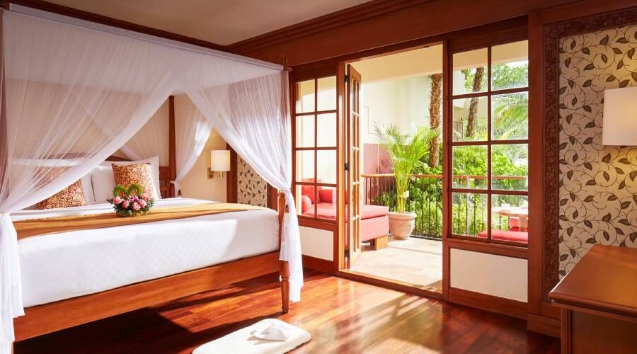 Escape from your everyday grind in true Ayodya flair with a spacious classic deluxe accommodation that overlooks lush tropical gardens. Enjoy spacious 48 sqm furnishings in soft tones with timber fittings, traditional Balinese artwork, a private outdoor balcony, and lovingly crafted amenities.